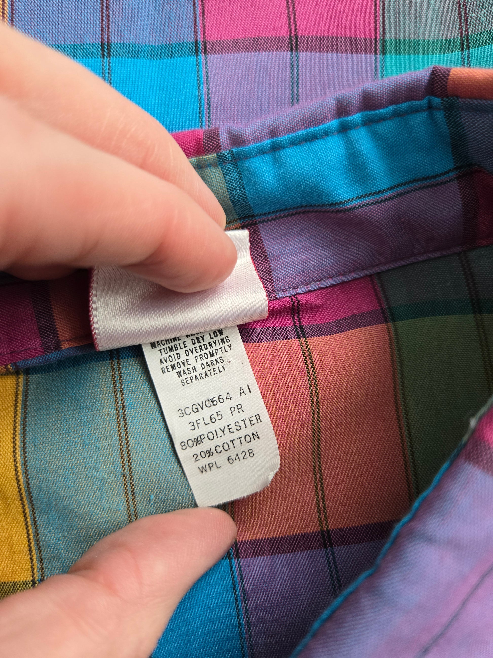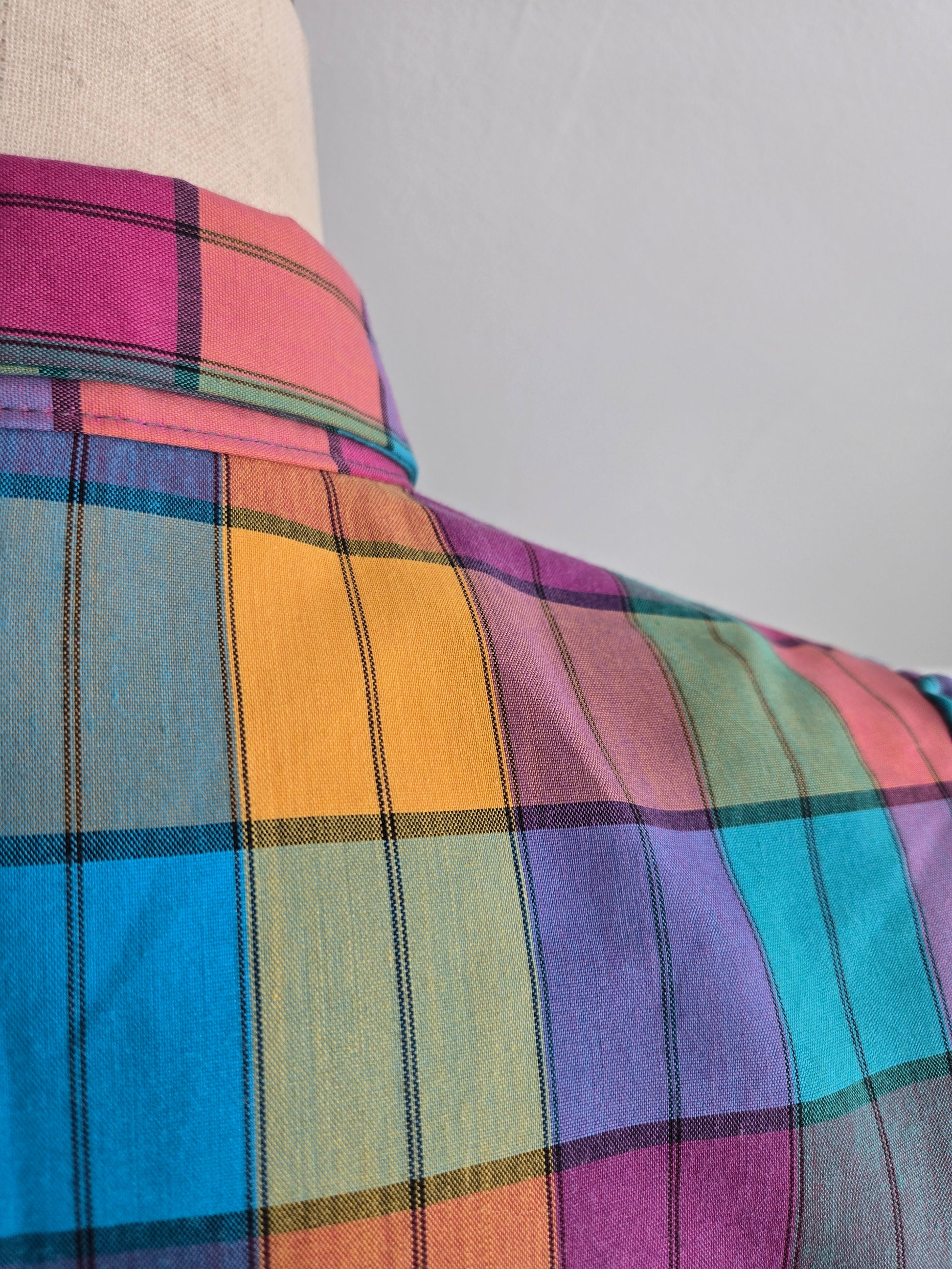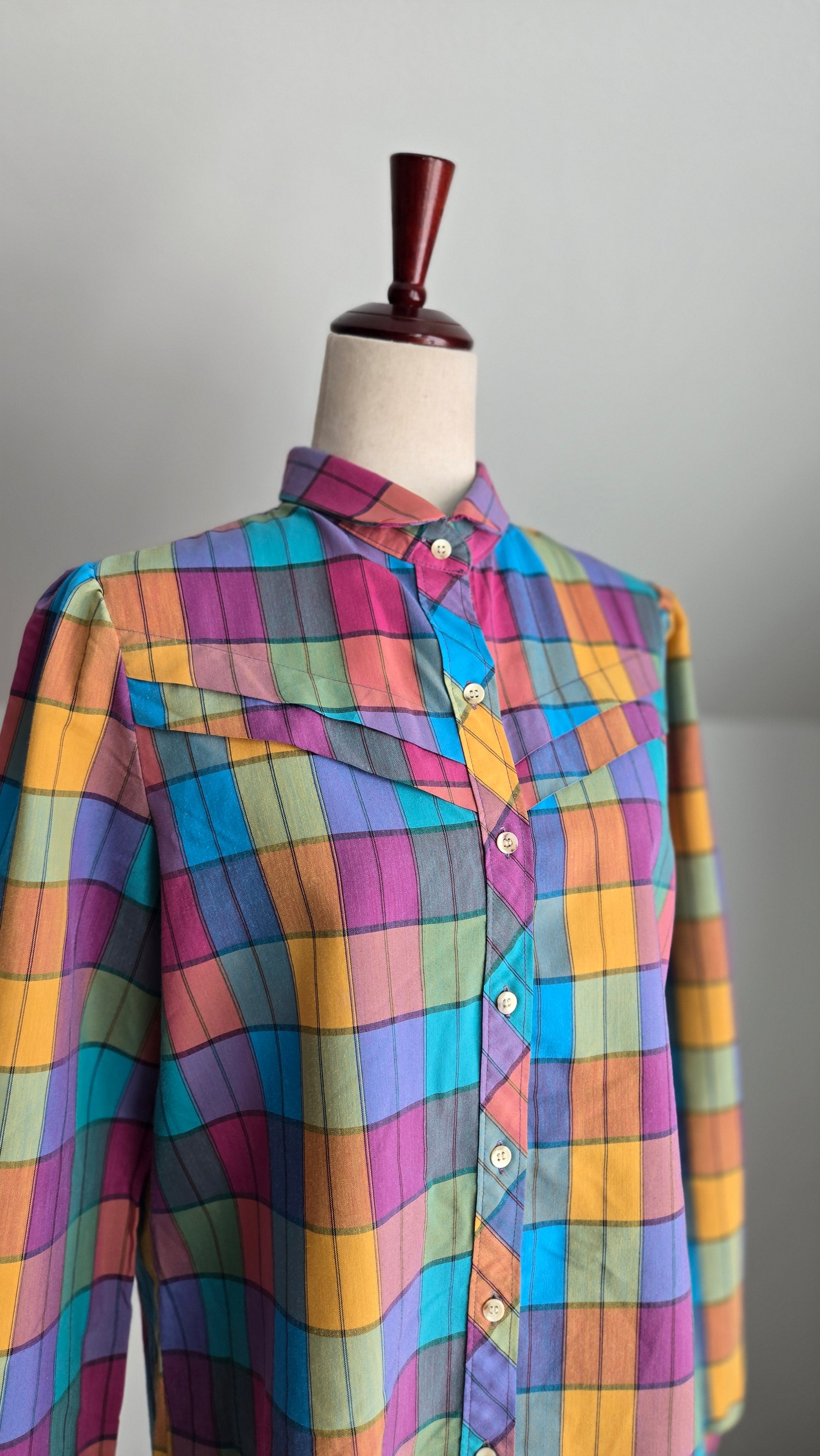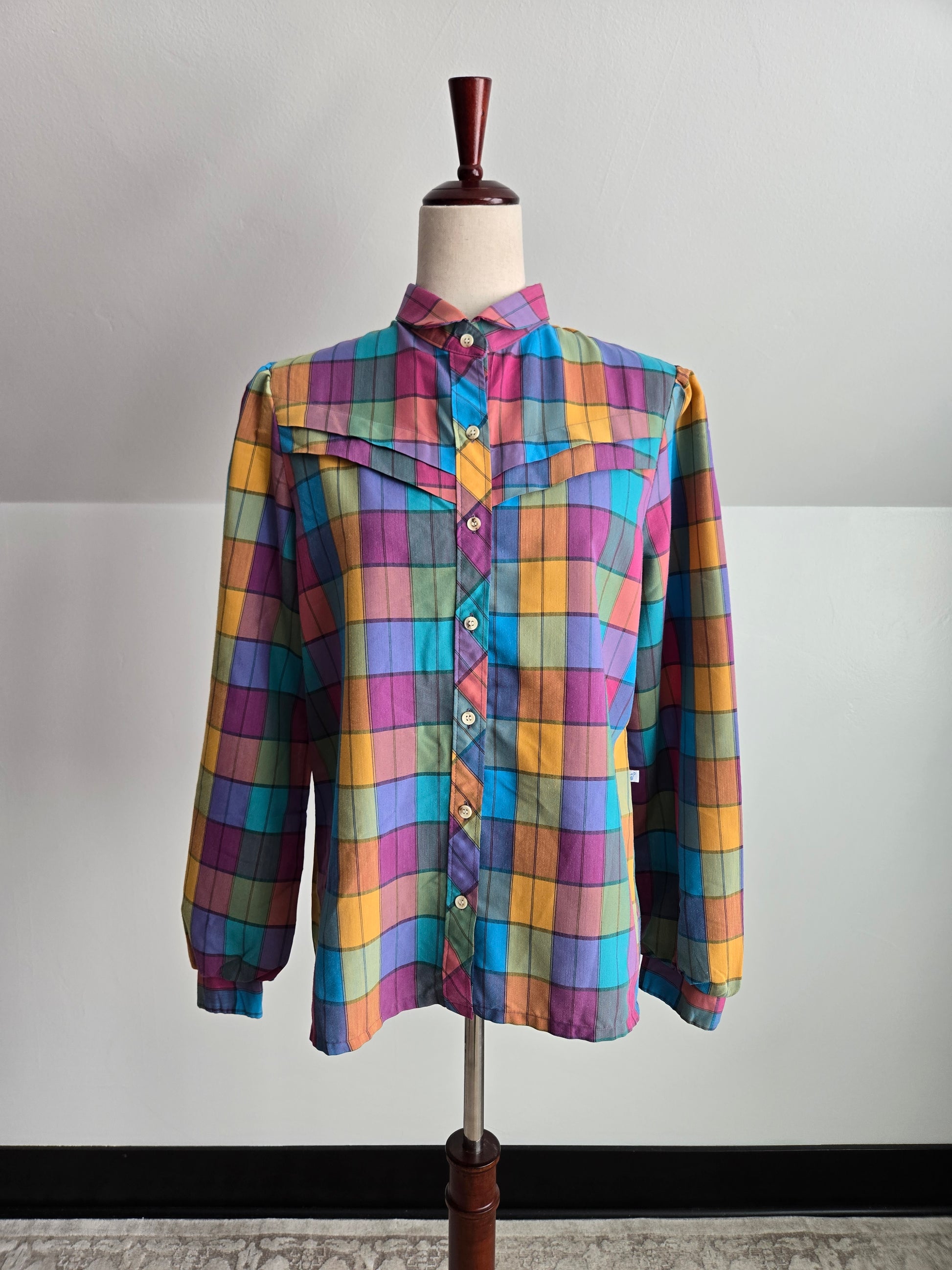 Wrangler vintage 70s colorful rainbow plaid button down western shirt. It has western pleated seam lines at the front and buttoned cuffs. There is a small horse woven label at the side seam. It is in perfect condition and freshly laundered.