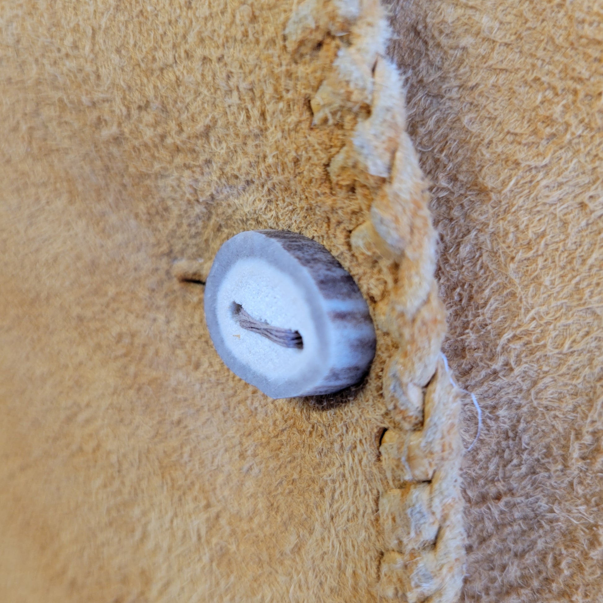 Wyoming Fur and Leather Company vintage fully lined genuine suede leather western vest. This piece has real antler carved buttons, and leather oversized stitching around all edges. It does have some wear from age, but nothing major and no stains on the outside. The liner does have some water staining, but it is only visible inside the vest.
