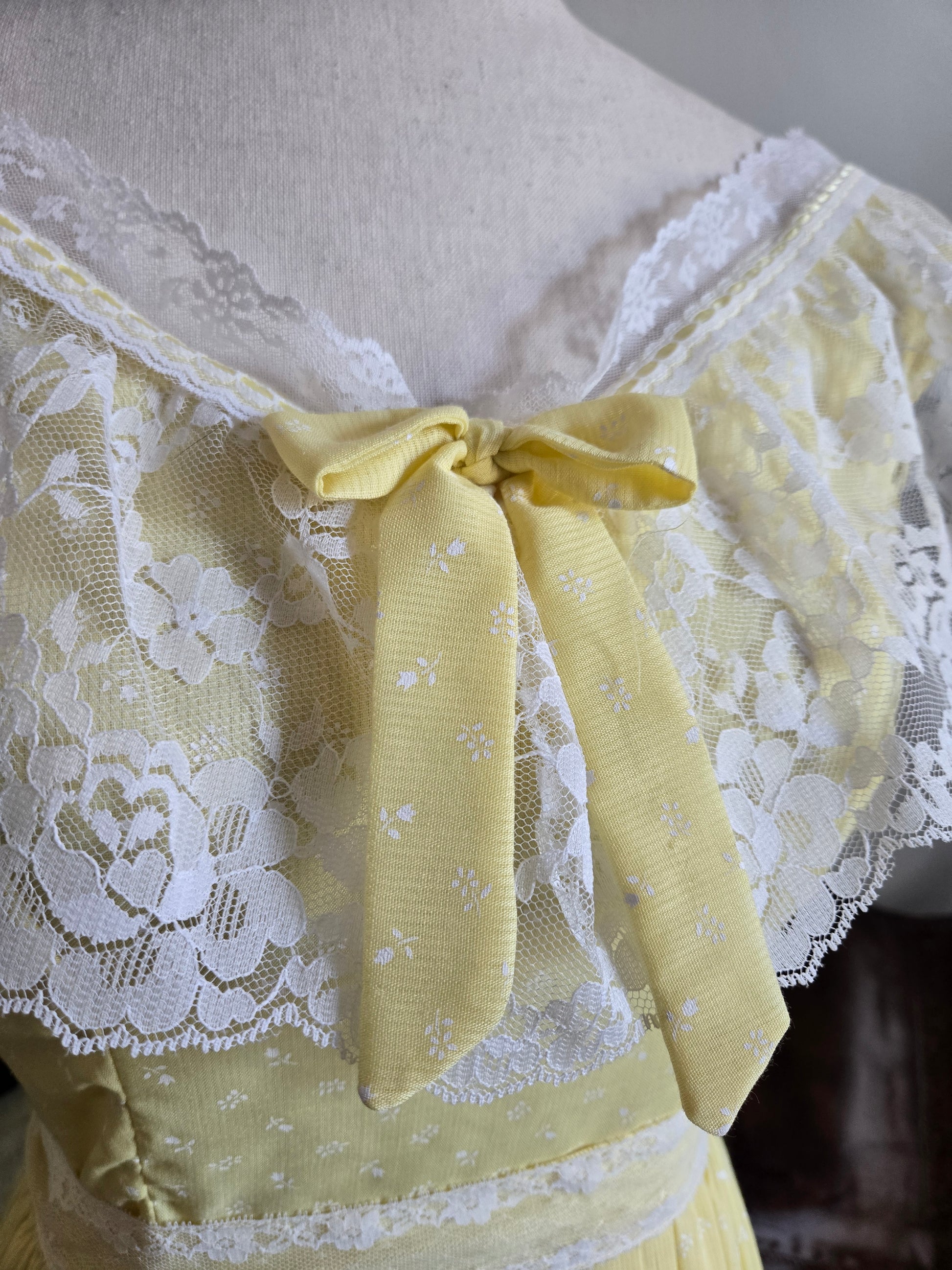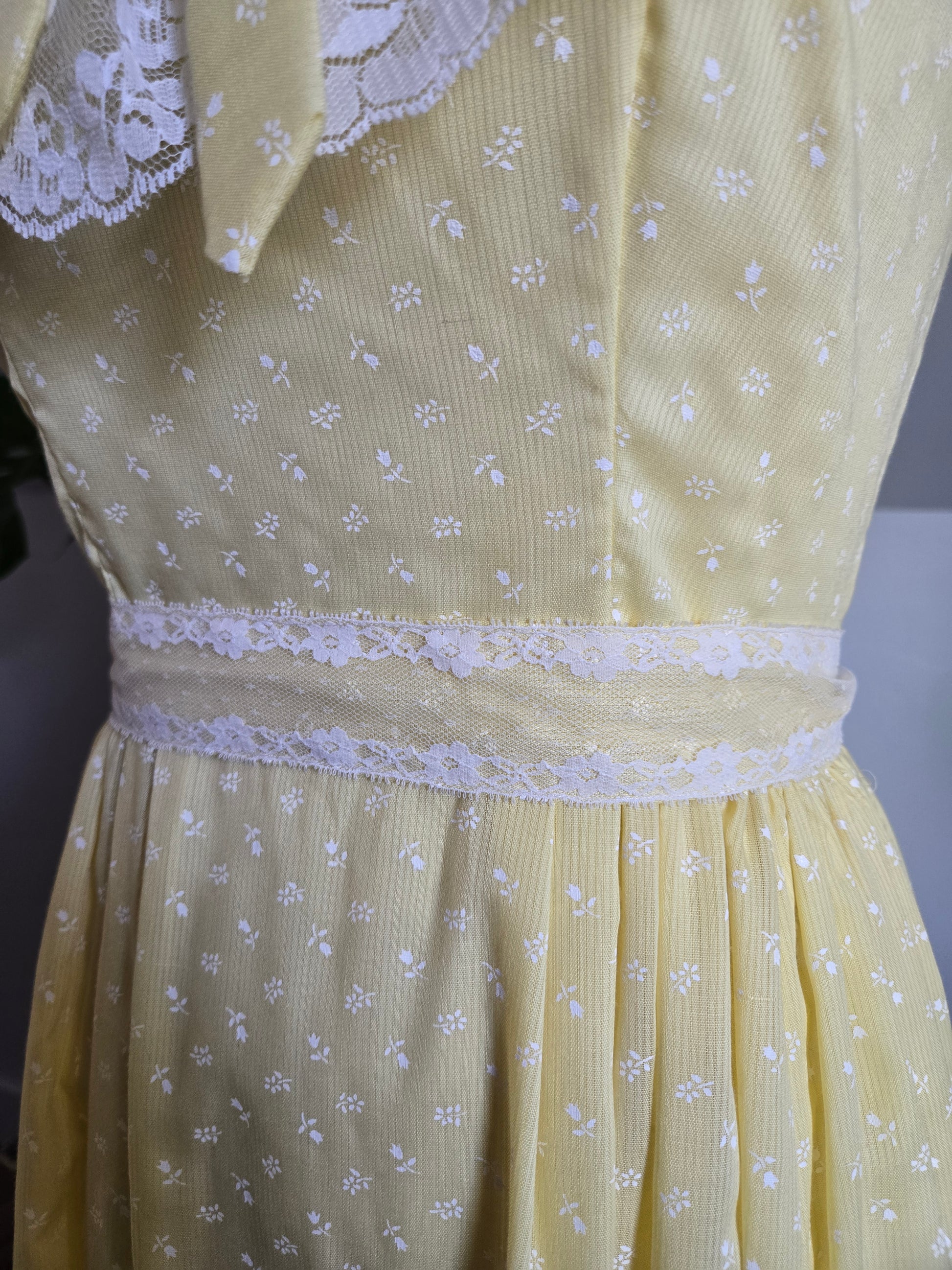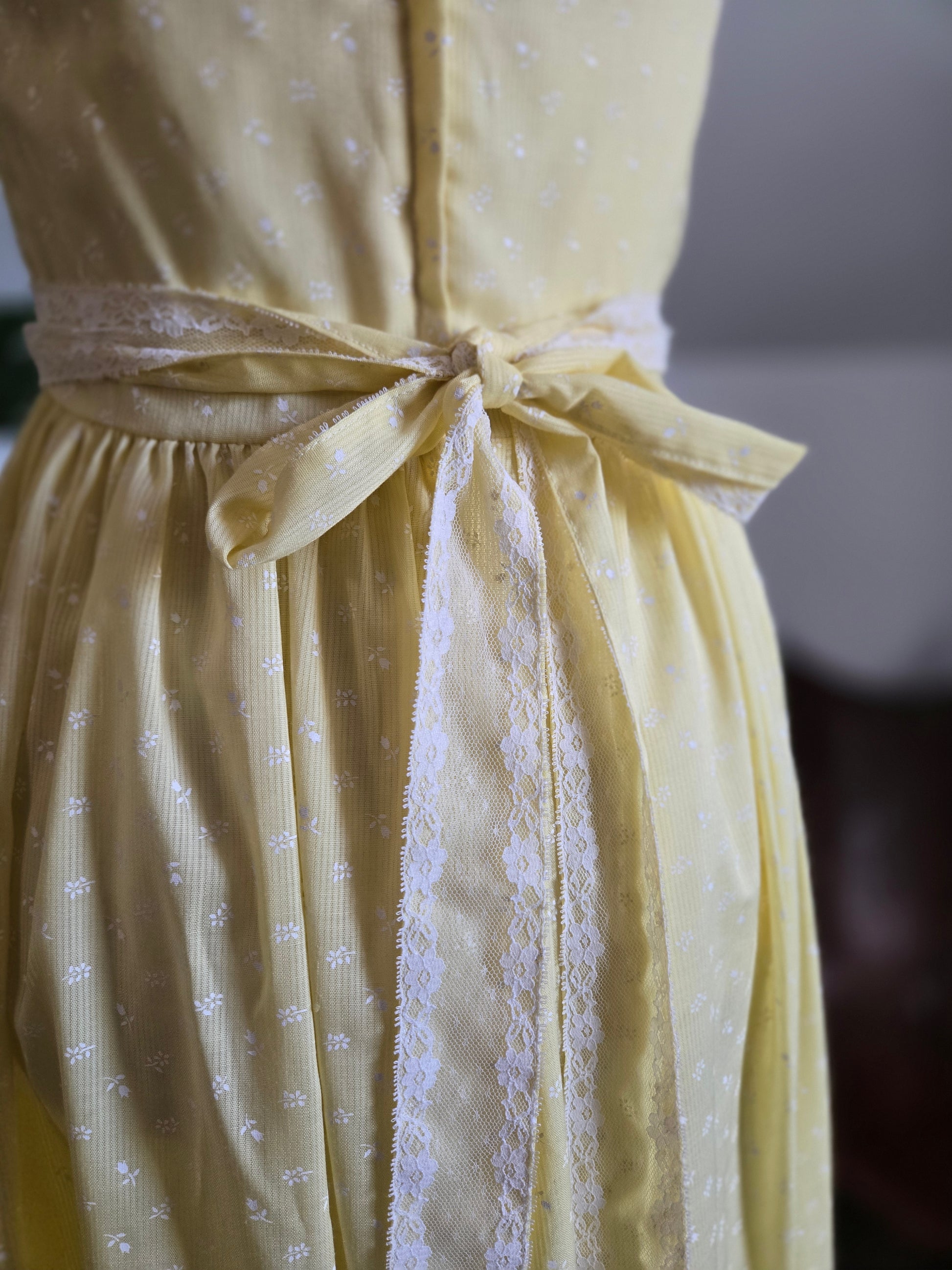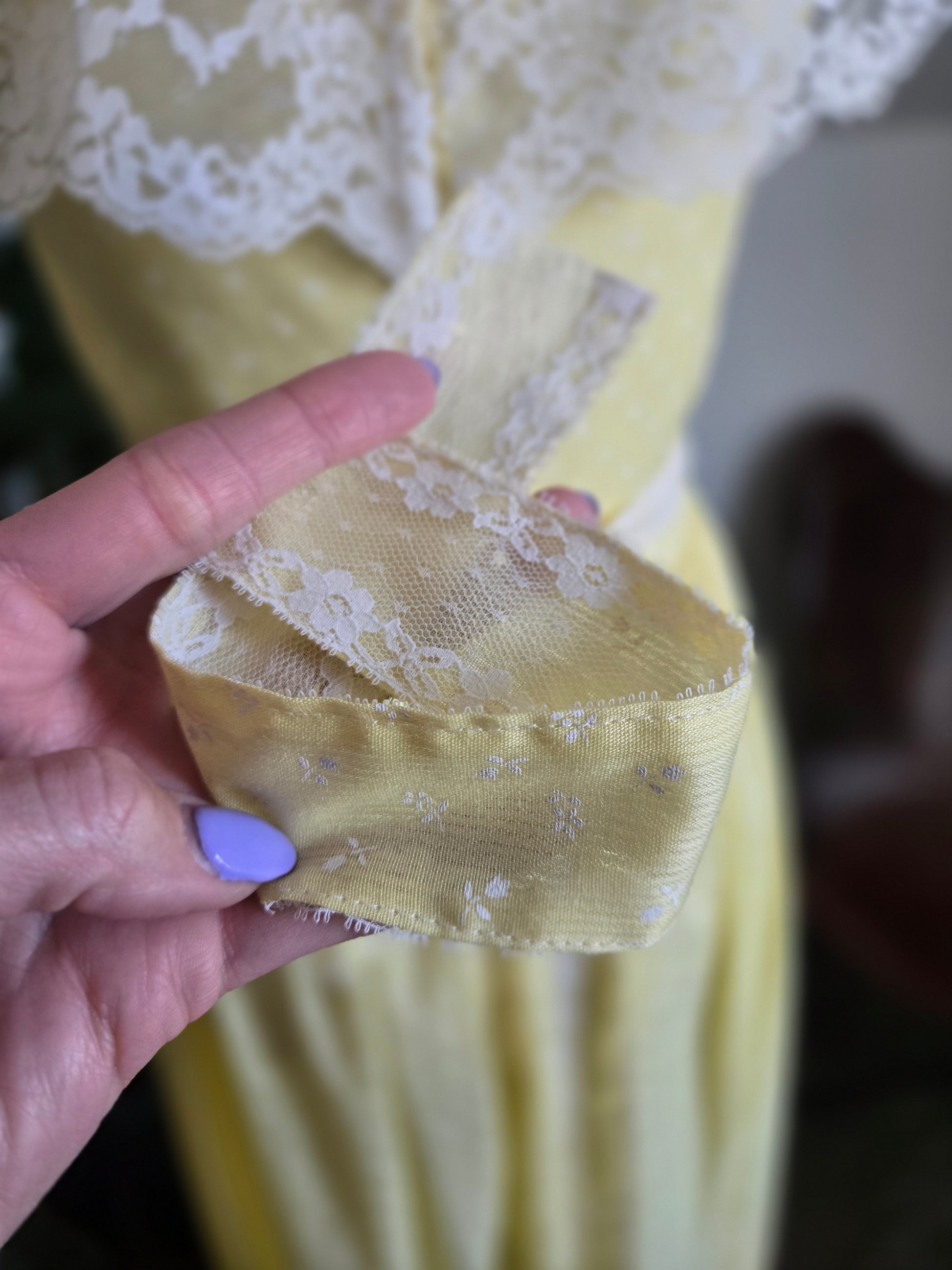 The most stunning vintage yellow cotton maxi prairie dress with white lace at the neckline. The lace turns into a small flutter sleeve and then there is a fabric bow in the middle. The fabric belt has lace delicately sewn into one side, and is completely detachable. The little white florals throughout the fabric are printed on, so they are slightly raised from the cotton. It has a Talon zipper in the back and is in perfect condition. The upper body is lined with a satin material, but the skirt is unlined. would suggest wearing a slip skirt underneath.
