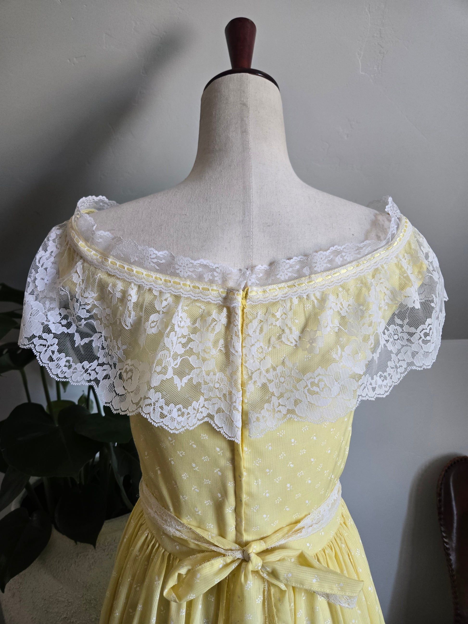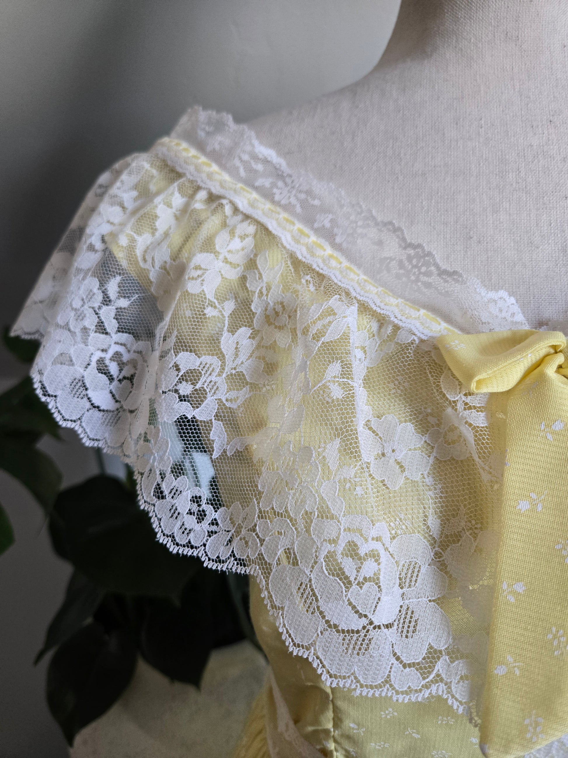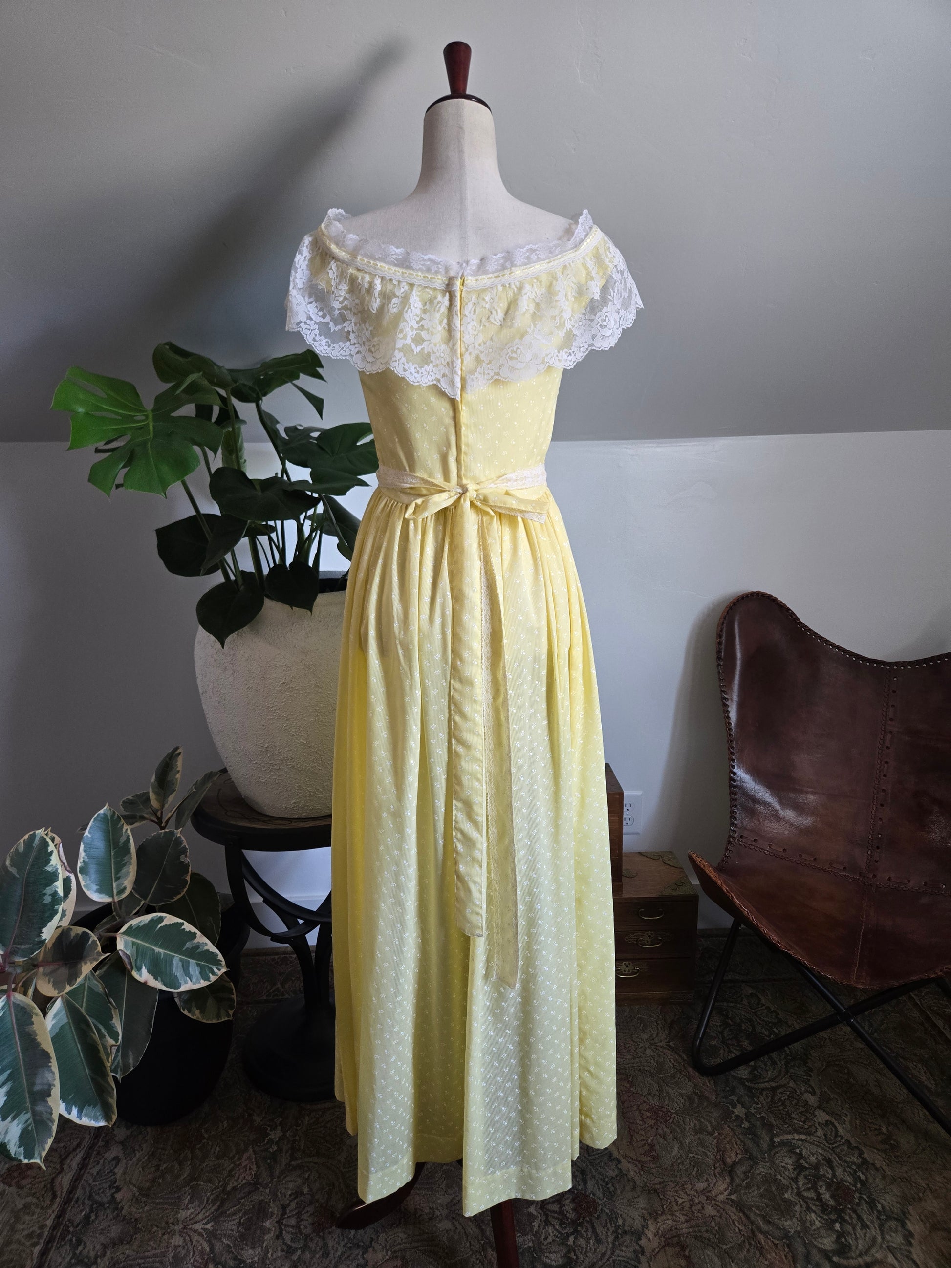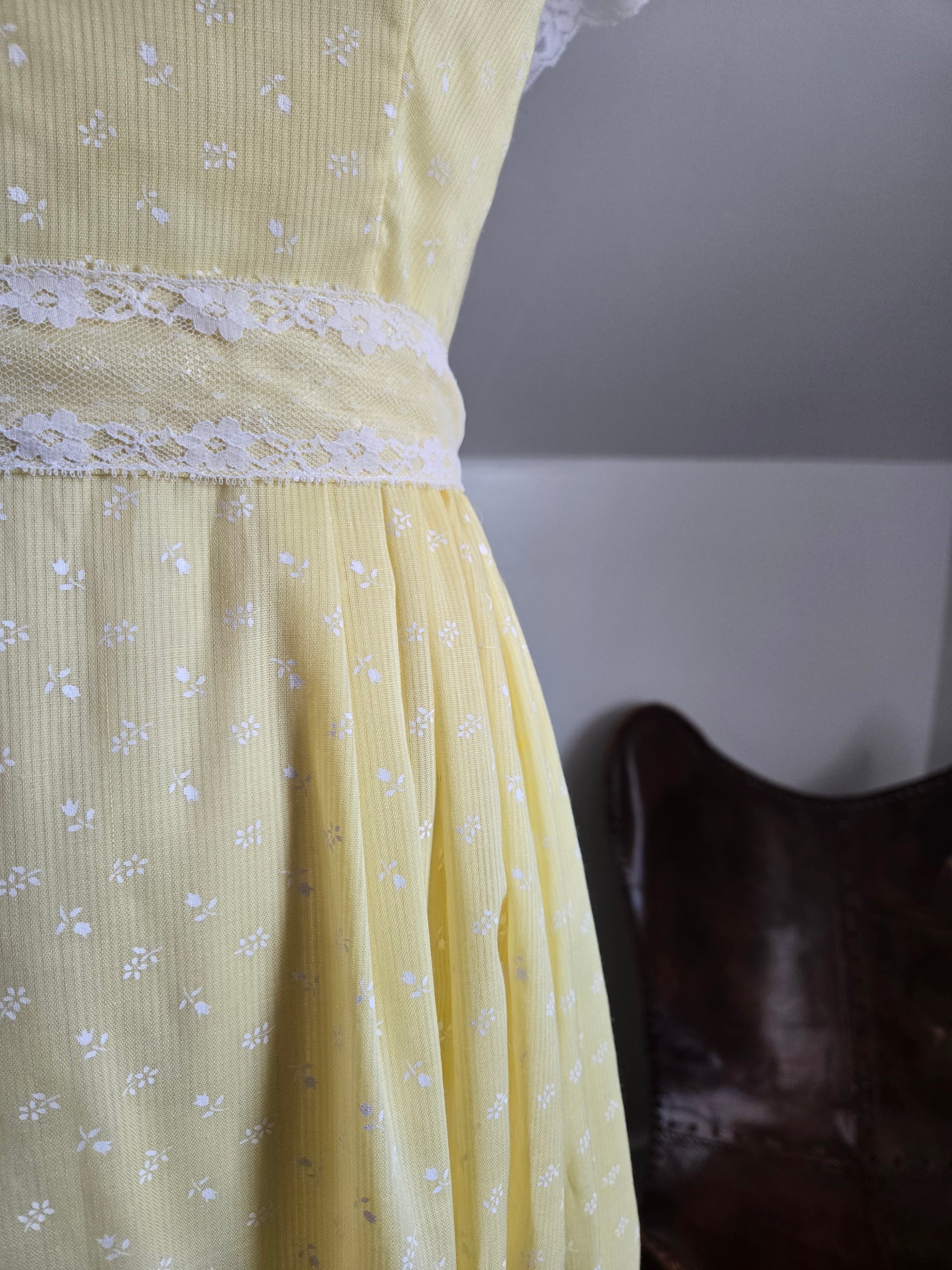 The most stunning vintage yellow cotton maxi prairie dress with white lace at the neckline. The lace turns into a small flutter sleeve and then there is a fabric bow in the middle. The fabric belt has lace delicately sewn into one side, and is completely detachable. The little white florals throughout the fabric are printed on, so they are slightly raised from the cotton. It has a Talon zipper in the back and is in perfect condition. The upper body is lined with a satin material, but the skirt is unlined. would suggest wearing a slip skirt underneath.