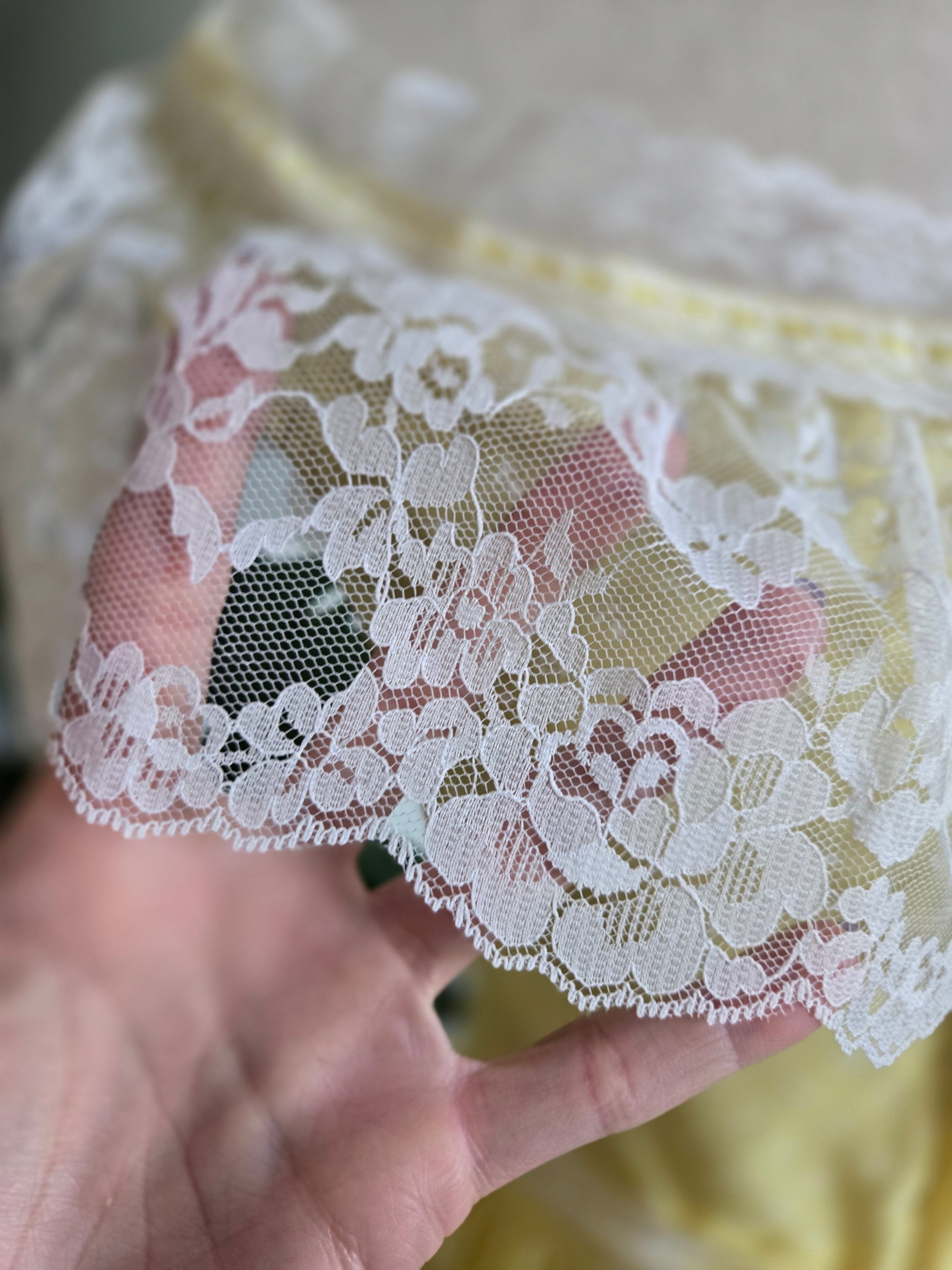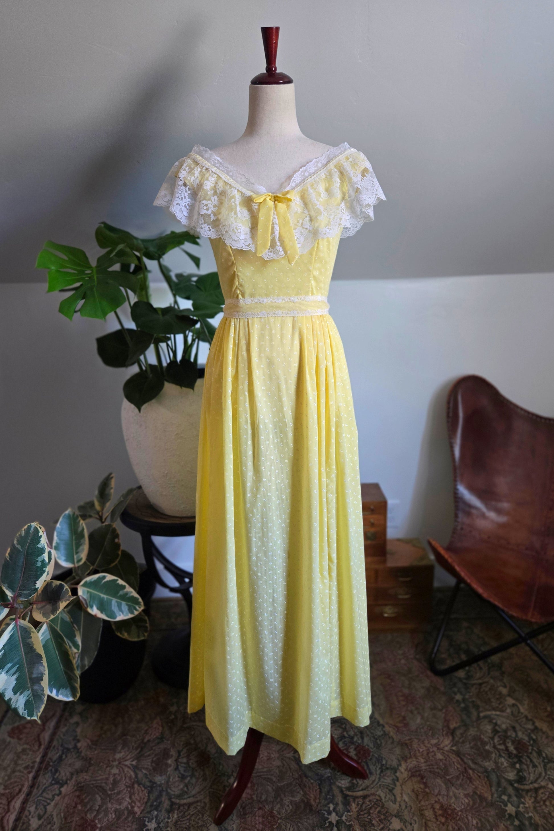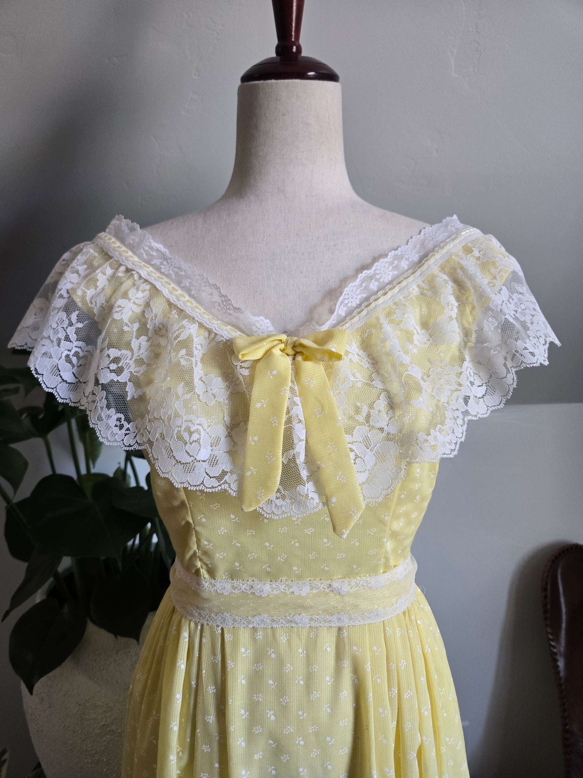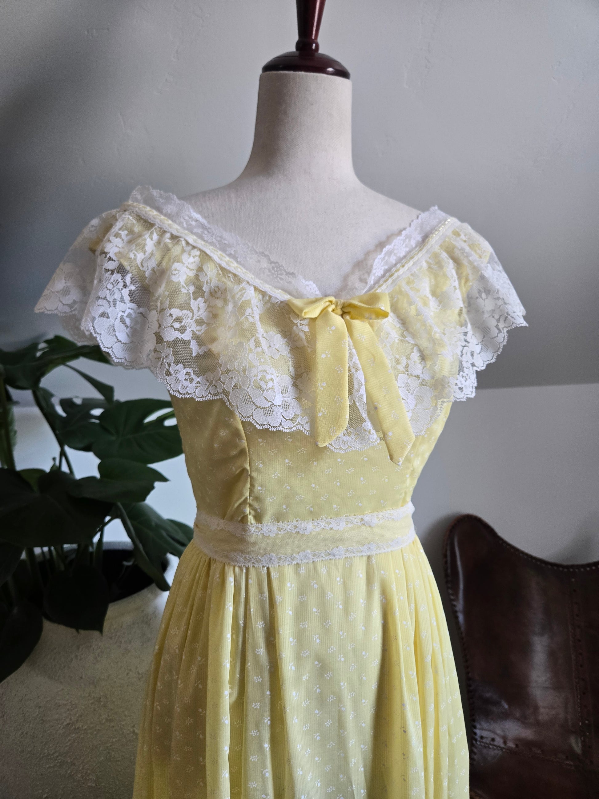 The most stunning vintage yellow cotton maxi prairie dress with white lace at the neckline. The lace turns into a small flutter sleeve and then there is a fabric bow in the middle. The fabric belt has lace delicately sewn into one side, and is completely detachable. The little white florals throughout the fabric are printed on, so they are slightly raised from the cotton. It has a Talon zipper in the back and is in perfect condition. The upper body is lined with a satin material, but the skirt is unlined. would suggest wearing a slip skirt underneath.