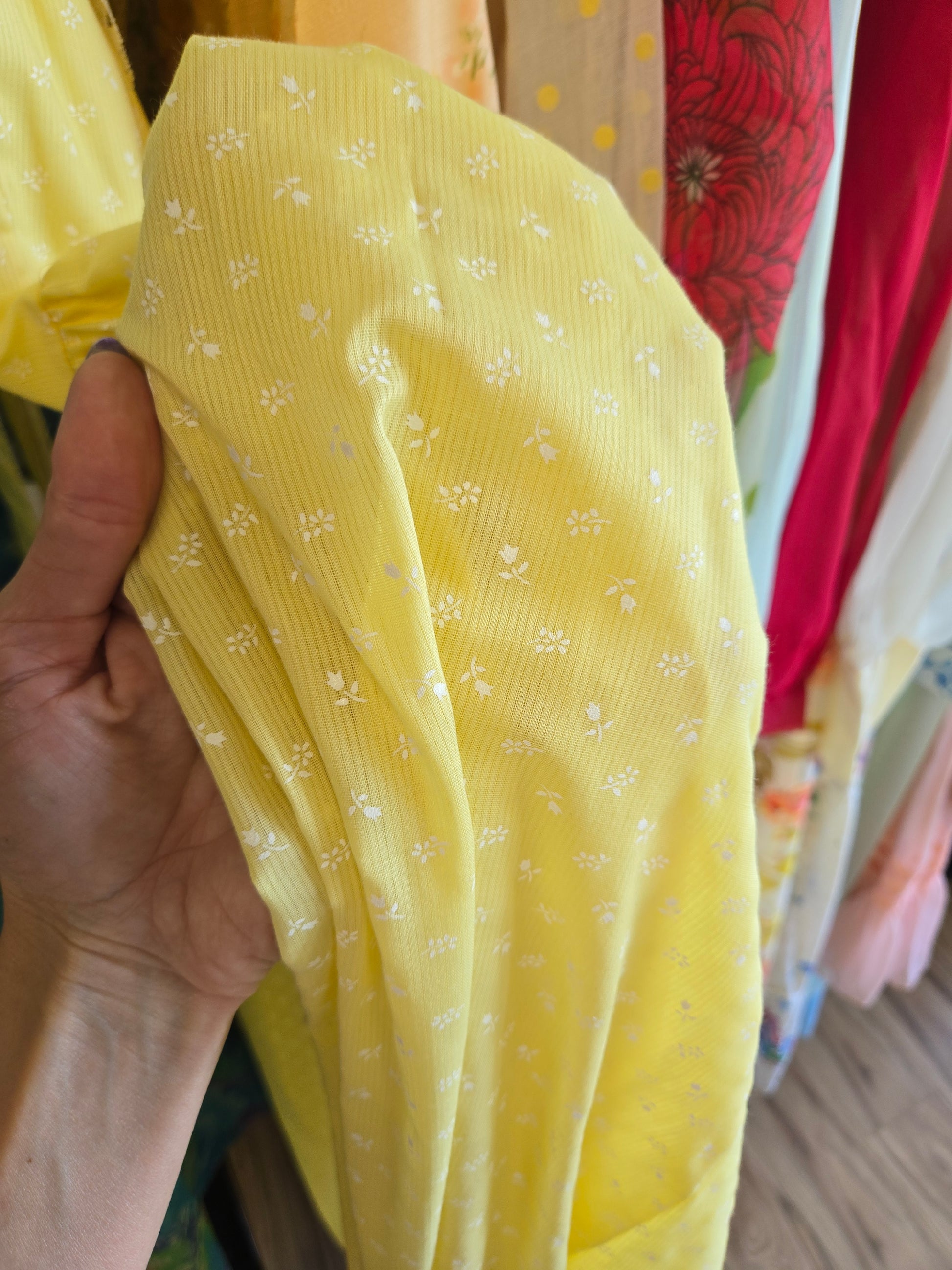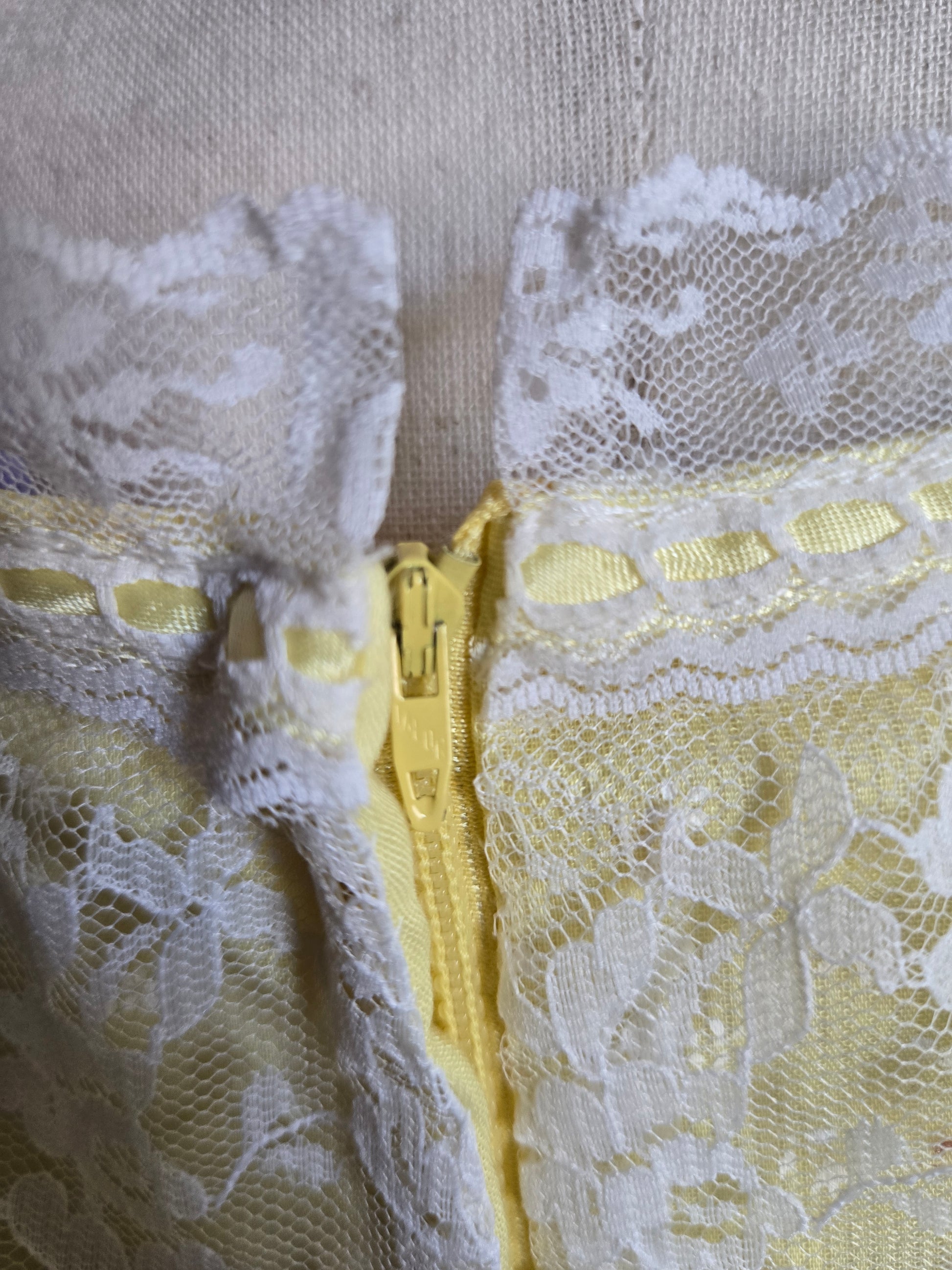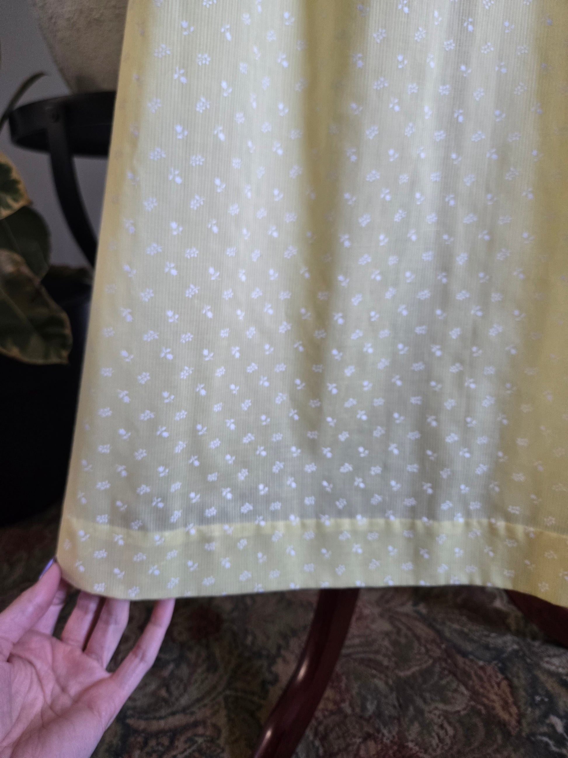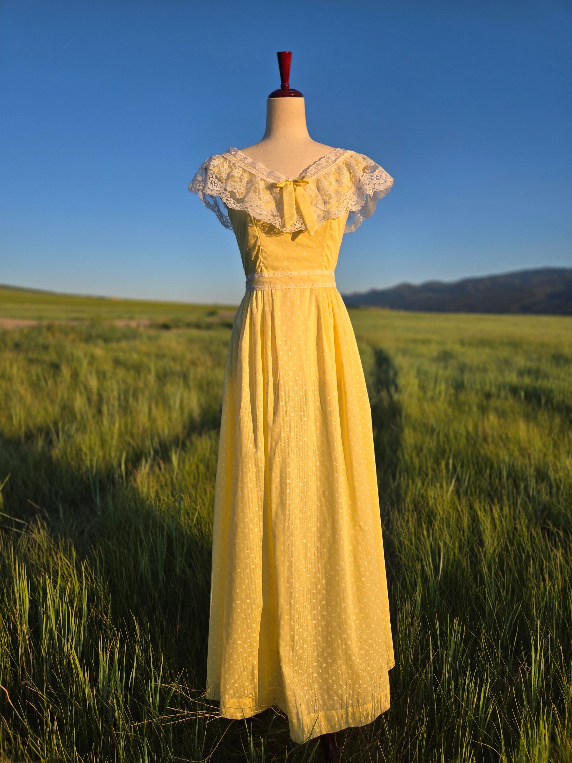 The most stunning vintage yellow cotton maxi prairie dress with white lace at the neckline. The lace turns into a small flutter sleeve and then there is a fabric bow in the middle. The fabric belt has lace delicately sewn into one side, and is completely detachable. The little white florals throughout the fabric are printed on, so they are slightly raised from the cotton. It has a Talon zipper in the back and is in perfect condition. The upper body is lined with a satin material, but the skirt is unlined. would suggest wearing a slip skirt underneath.