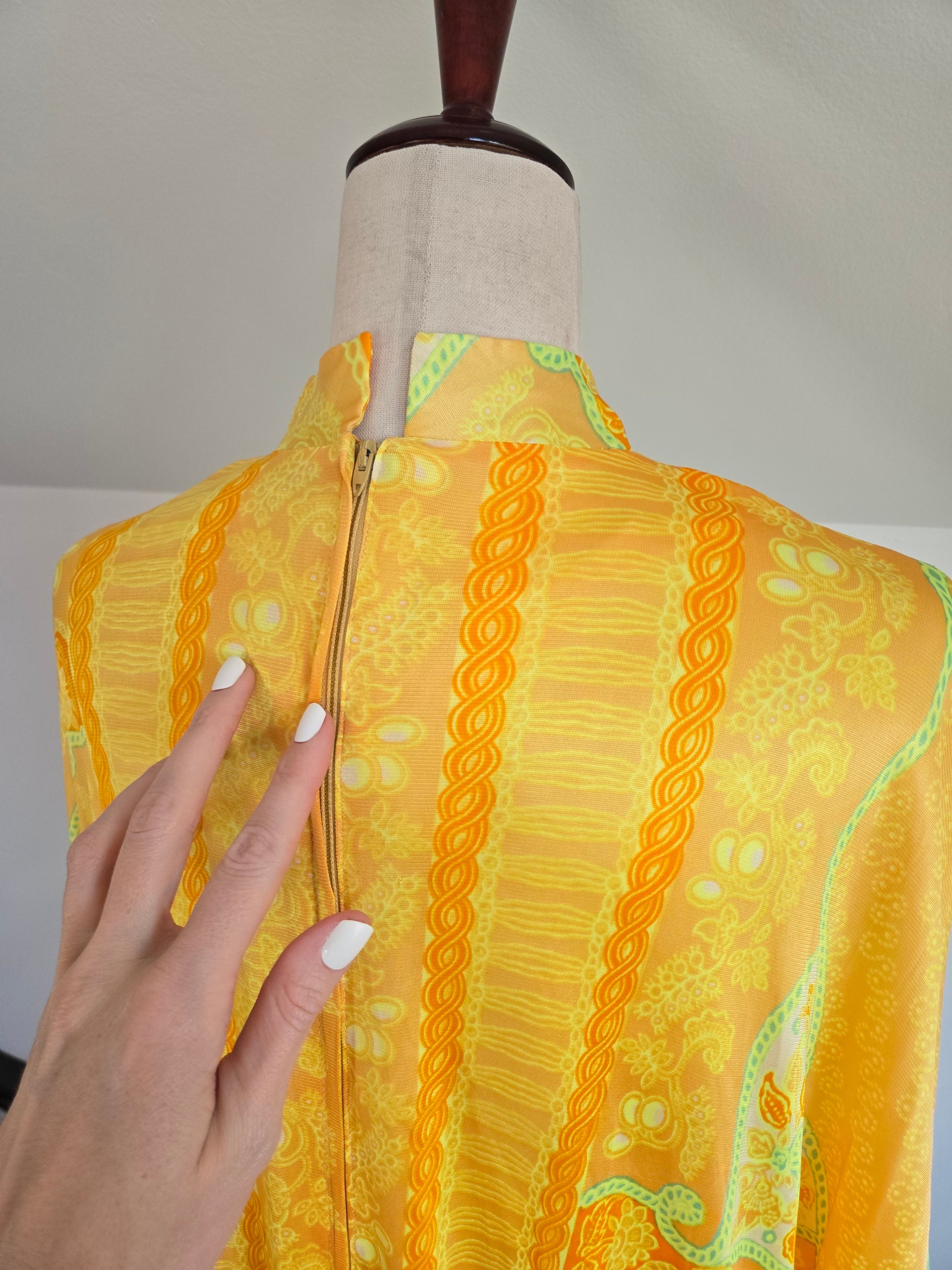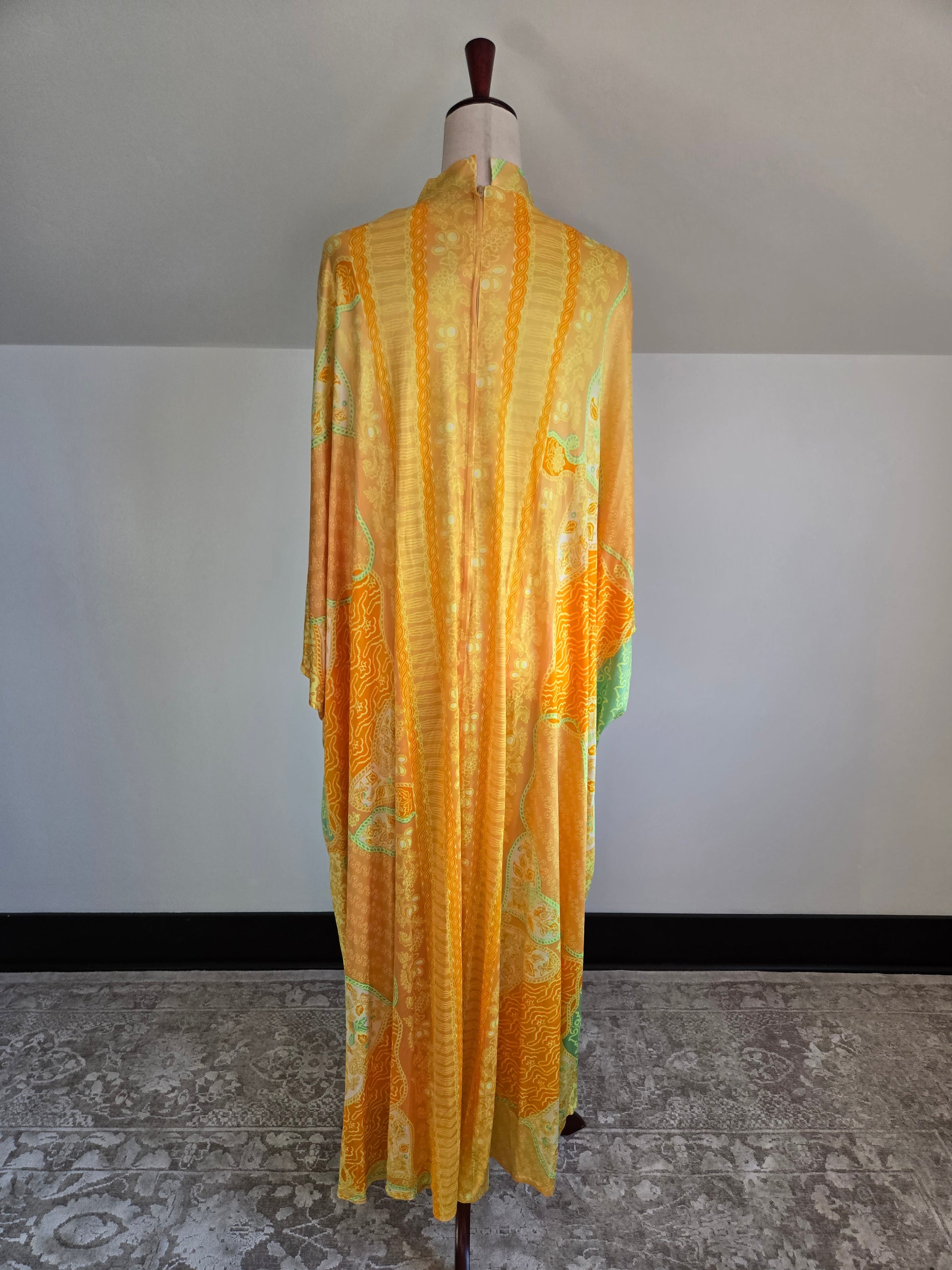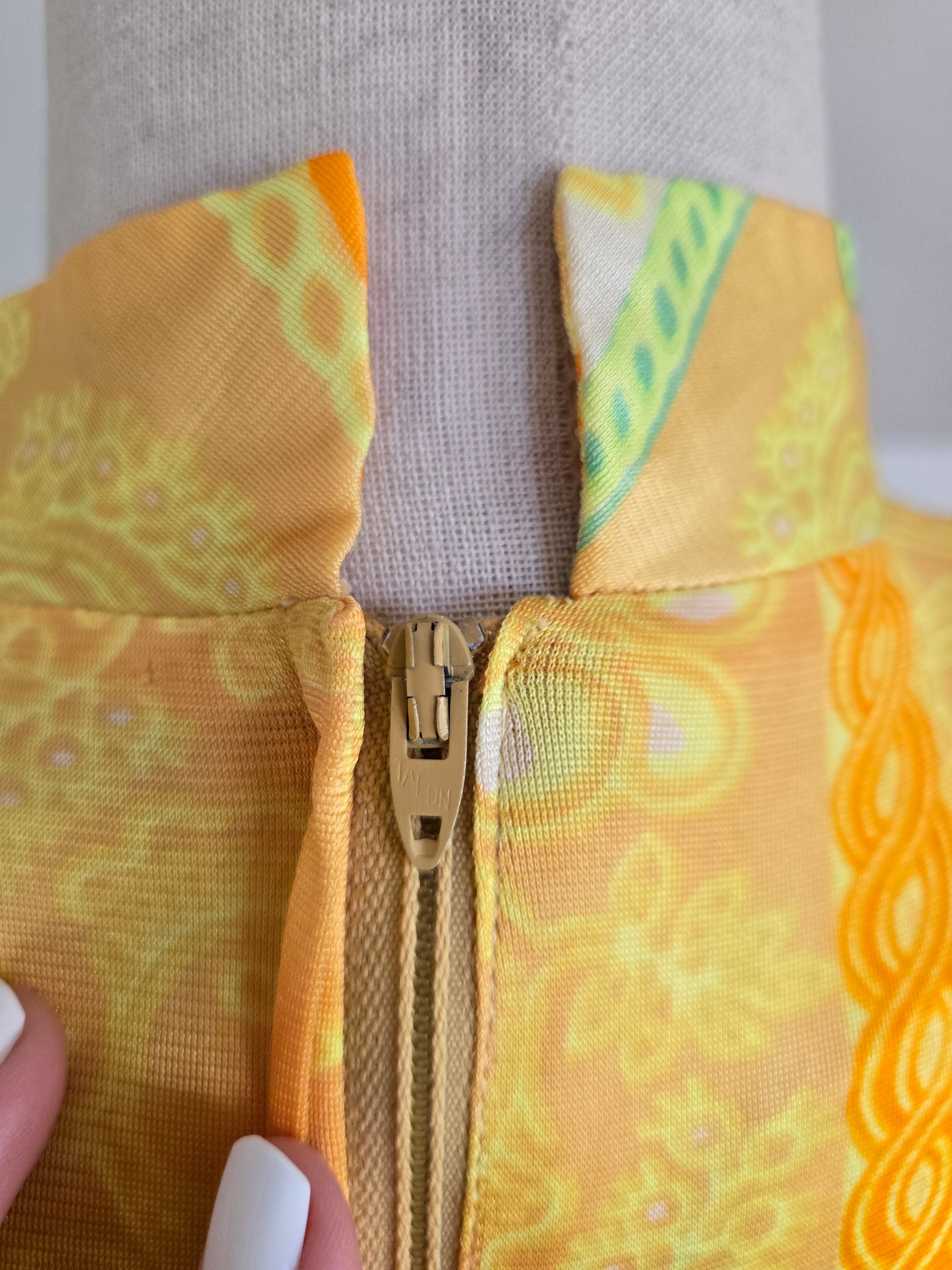 Windsor vintage 60s slinky nylon yellow and lime green caftan. It is a high mock neck and has a zipper up the back. It has an internal stretch webbing waist belt that velcros to cinch the waist in if you want to wear it that way. It has been washed and is in perfect condition. I believe beat for up to a large.