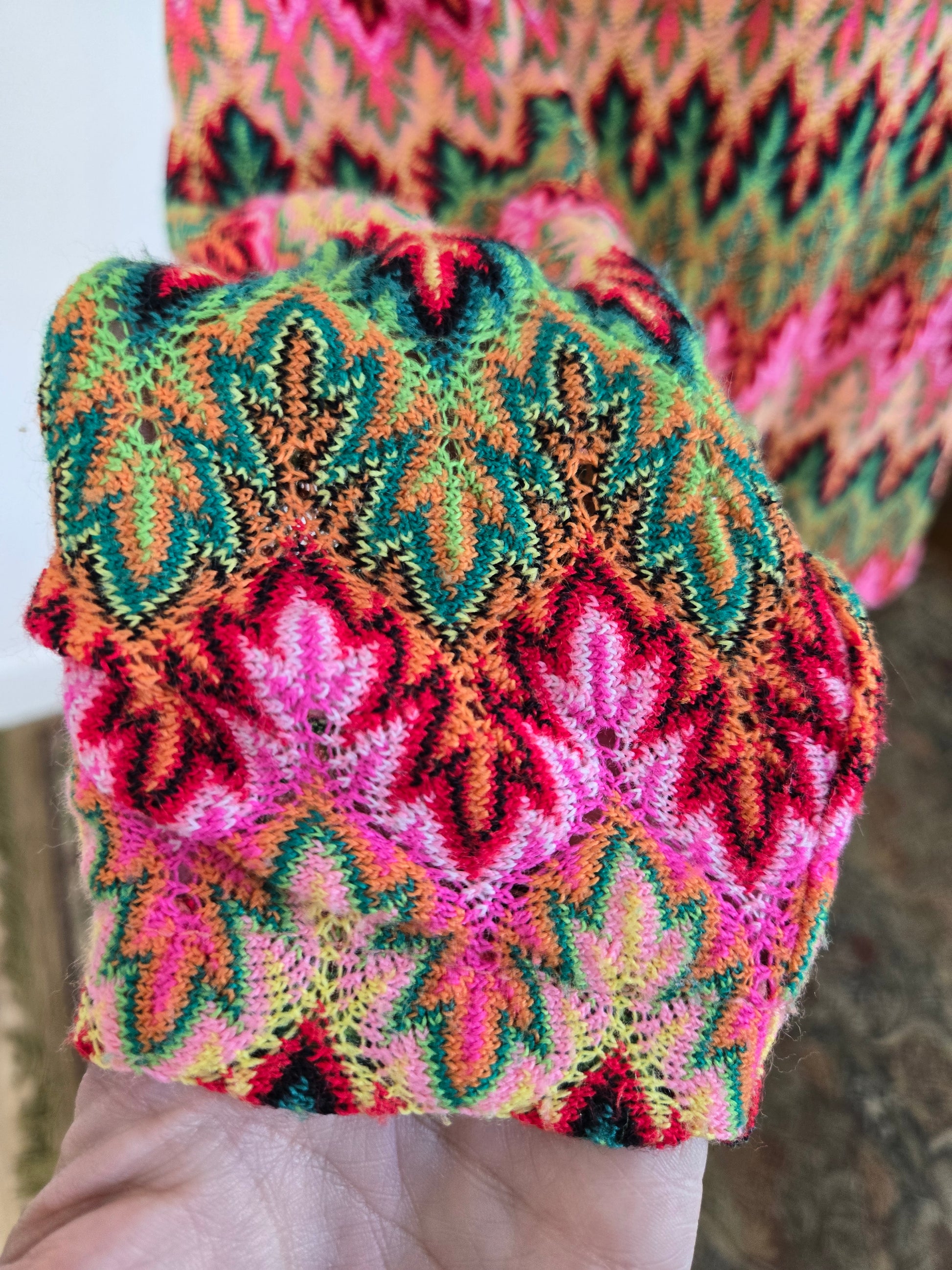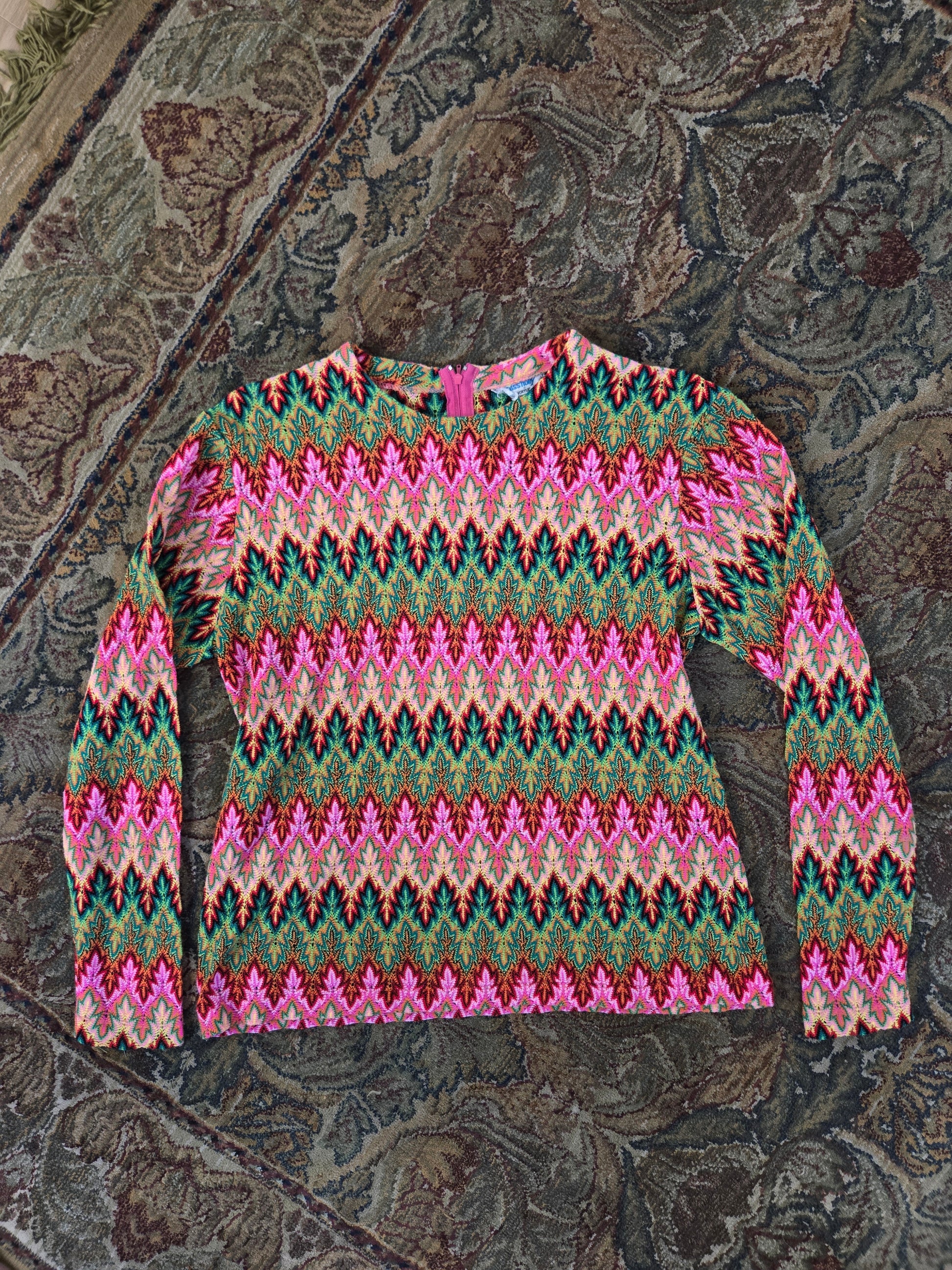 Miss Holly vintage 70s crochet top done in a vibrant zig zag pattern. It is semi shear since it is truly a crochet knit, and also has some stretch due to the construction of the material. It has a small zipper in the back to help get into it and has been washed, steamed, and is ready to wear. No condition issues to note. It is fabulous!!
